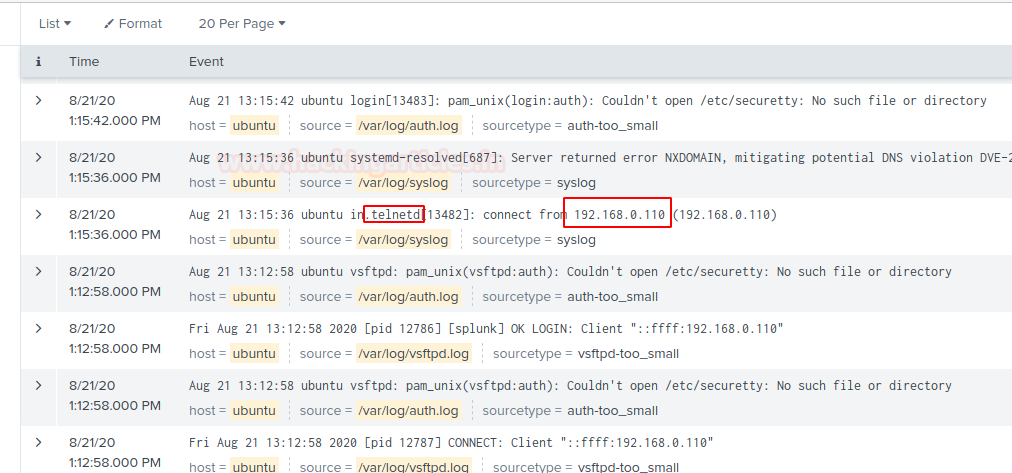 Now, we can see Telnet access logs of the server machine in Dashboard